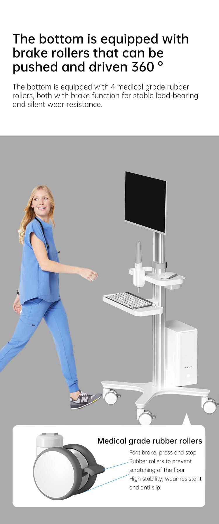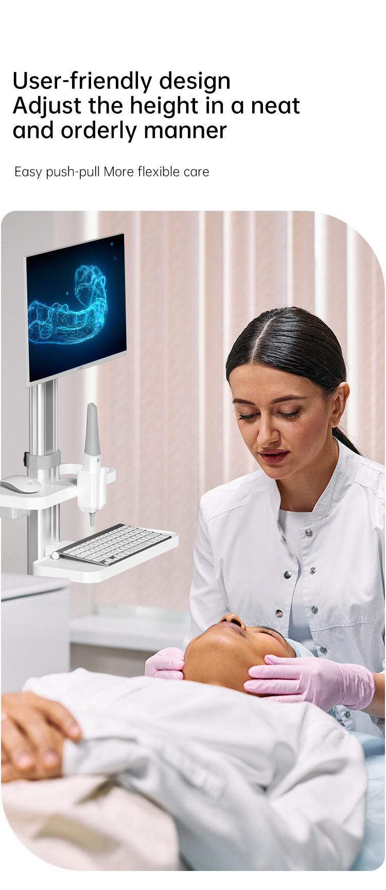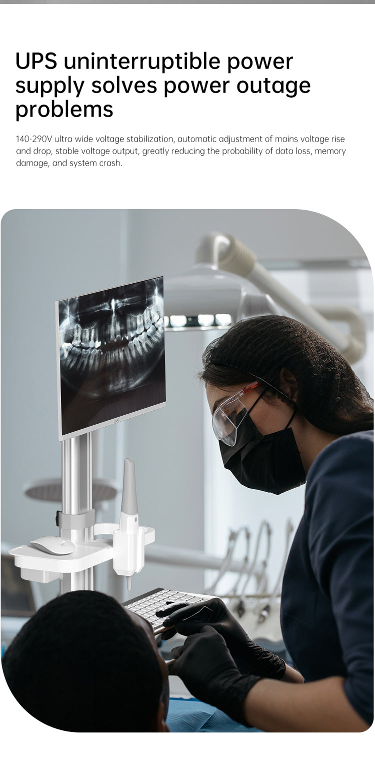 - PERFECT DESIGN:The medical cart has 1 large tabletop,1 oral scanner holder(adaptation 3shape,itero,sirona,planmeca),1 keyboard holder,1 mouse holder,1 built-in plug outlet,and the height of the VESA is adjustable